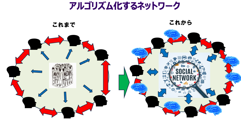 ところが、人と人のコミュニケーションがSNS経由となり、かつ膨大な数のAIもネットワークに参加し、人間を介することなくAIとAIが直接ネットワーク経由でコミュニケーションをとる場面も今後増えていく。SNSやAIが依存しているのはアルゴリズムだ。つまり、人とアルゴリズム(SNSやAI)の塊がネットワーク化され、人による意思決定にアルゴリズムが大きく影響を与えるようになる。