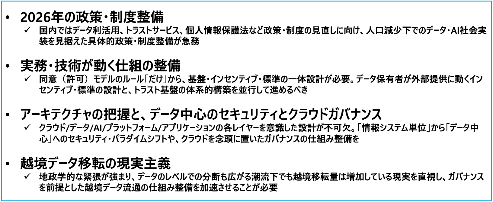 デジタル政策フォーラムでは、2026年3月上旬に『AIガバナンスに関する提言 Ver 3.0』を公表する。有識者、ユーザー企業、クリエイターなどへのヒアリングを重ね、まとめ上げた政策提言の第3弾である。本基調講演では、その内容をベースとして踏まえ、AI時代のデータガバナンス、デジタルガバナンスについて海外動向を含めて俯瞰・アップデートした。