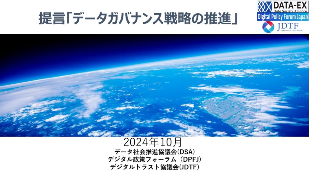 DPFJ(デジタル政策フォーラム、代表幹事:谷脇康彦)は、DSA(一般社団法人データ社会推進協議会、代表理事:奥井規晶)及びJDTF(一般社団法人デジタルトラスト協議会、理事長:手塚悟)と共同して、提言「データガバナンス戦略の推進」を策定・公表しました。