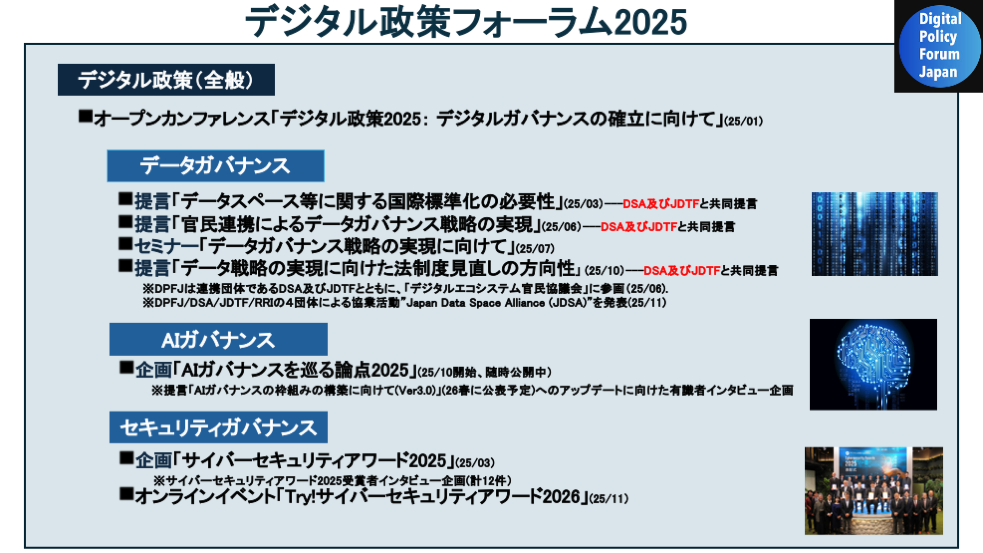 2025年—デジタル政策の領域は様々な方面で大きく動き、DPFJの活動範囲もさらに広がった。本稿では2025年におけるDPFJの活動を振り返りたい。DPFJではデジタル政策を巡る議論について、「我々はデジタル技術を適切なルールの下で十分に制御できるのか」というデジタルガバナンスの観点で俯瞰的に捉えようと試みてきた。このデジタルガバナンスを巡る議論は、データガバナンス、AIガバナンス、セキュリティガバナンスという3本柱で捉えることができる。