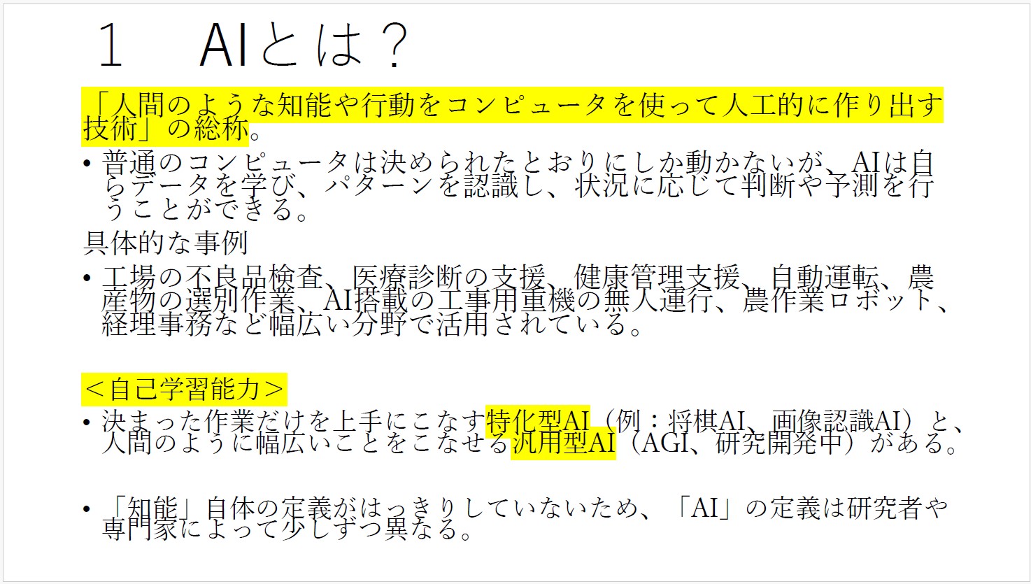 AI(人工知能)とは、「人間のような知能や行動をコンピューターを使って人工的に作り出す技術」の総称である。既に幅広い分野で活用されている。例えば、工場の不良品検査、医療診断の支援、健康管理支援、自動運転、農産物の選別作業、工事用重機の無人運航、農作業ロボット、経理事務などである。