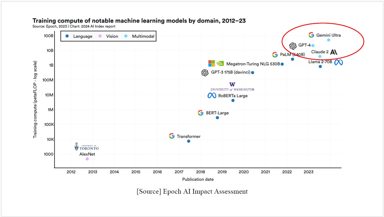 下のグラフは、米スタンフォード大学がまとめたもの(The 2024 AI Index Report)。2012年から最近までの主要AIモデルが、スーパーコンピューターの計算能力をどれほど必要としたかを示している。縦軸が計算速度で、単位はペタ(千兆)フロップ。GoogleのGemini Ultraは、1000億ペタフロップに近いレベル。GPT-4は100億ペタフロップ、AnthropicのClaude 2もそれに近いレベルで、これらはいずれもマルチモーダルである。