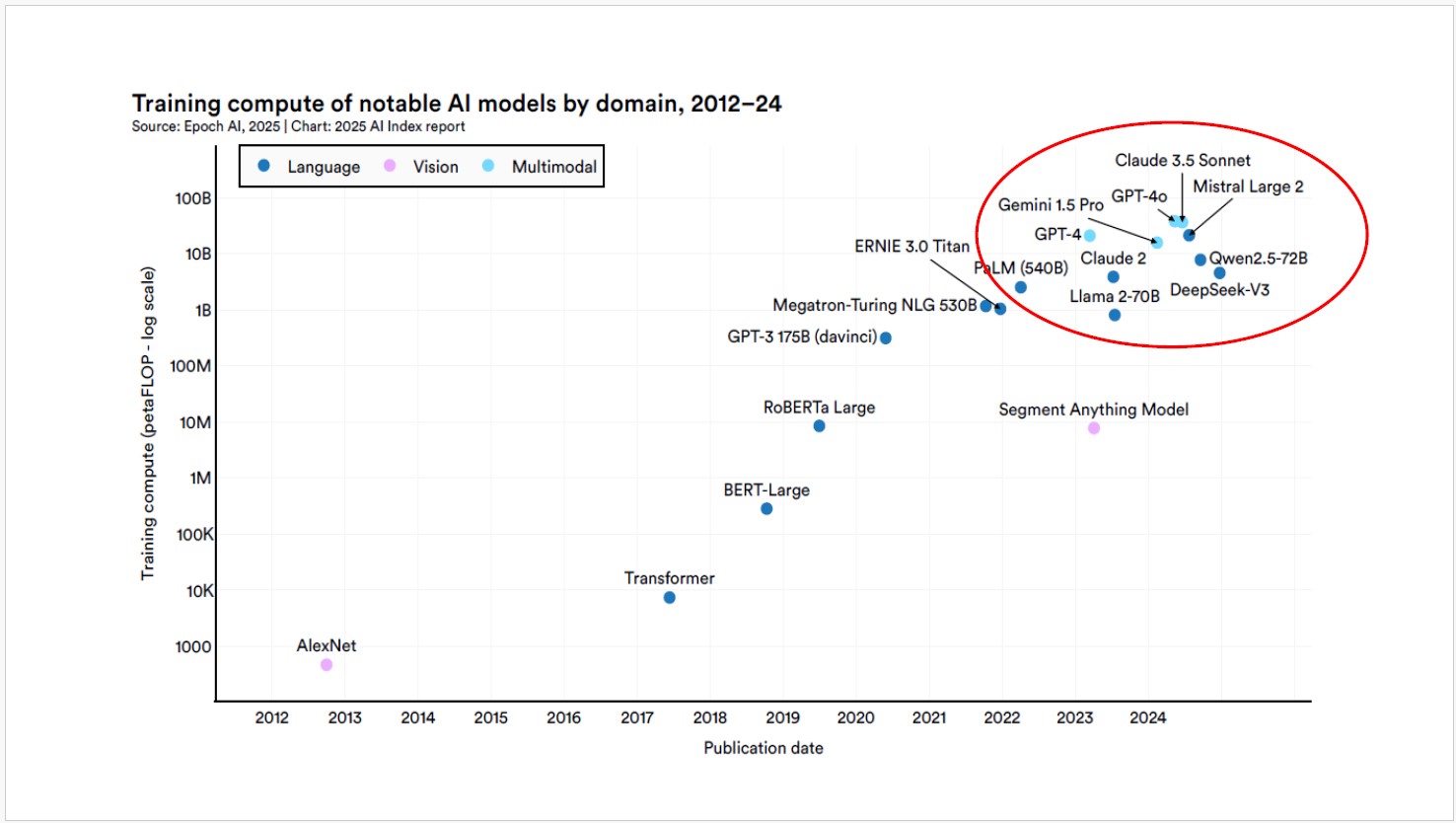 2024年になると様子が変わってくる。米スタンフォード大学の最新リポート(The 2025 AI Index Report)によると、仏MistralのLarge 2と中国AlibabaのQwe2.5が頭角を現してきたことが見て取れる。いずれもマルチモーダルのレベルには達していないが、それに匹敵するスーパーコンピューターの性能を繰り出している。中国DeepSeekのV3もレベルを上げている。