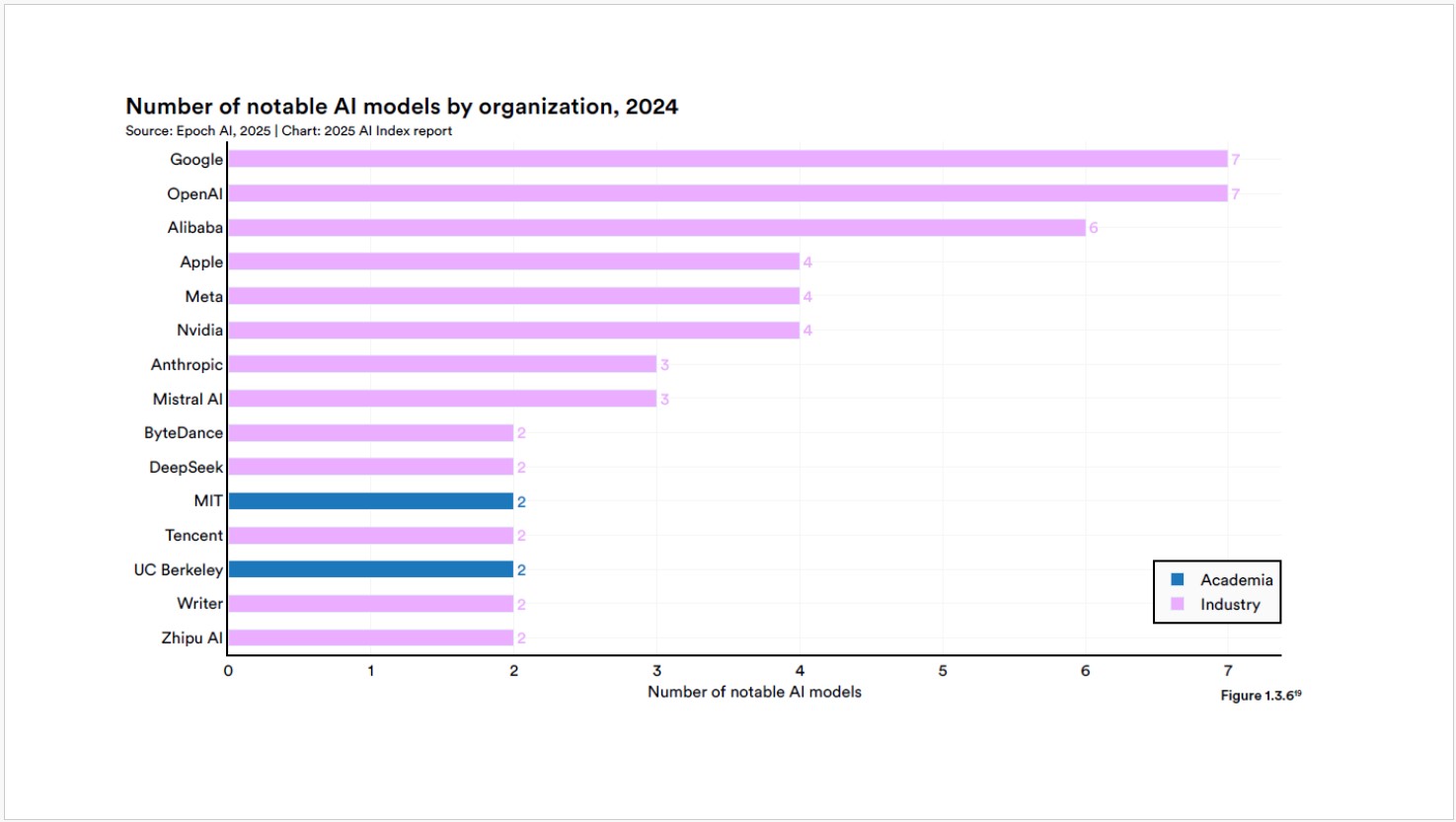 高性能AIモデルをいくつ持っているかというランキングでは、米Googleと米OpenAIが7機でトップ、中国Alibabaが6機、米Apple、米Meta、米NVIDIAが4機、米Anthropic、仏Mistral AIが3機、中国ByteDance、中国DeepSeek、中国Tencent、米Writer、中国Zhipu AIが2機と続く。