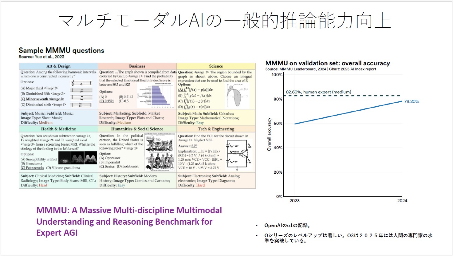 AIの性能を図るベンチマークには様々な試みがあり、その中でもMMMU(Massive Multi-discipline Multimodal Understanding and Reasoning Benchmark for Expert AGI)がよく使われている。大学卒業レベルの理解力と推論力を図るもので、芸術・デザイン、ビジネス、自然科学、健康・医学、人文・社会科学、技術・工学の6分野にわたる多数の問題がAIに与えられる。