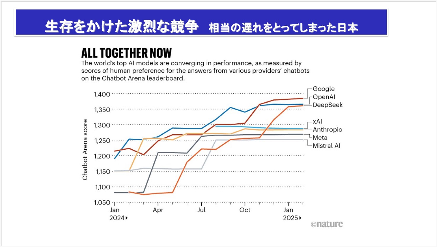 これは、Chatbot Arenaというベンチマークによる主要AIモデルの性能評価の推移で、米Google、米OpenAI、中国DeepSeekが熾烈なトップ争いを繰り広げている様が見て取れる。第二集団には、イーロン・マスク創業の米xAIのほか、米Anthropic、米Meta、仏Misrtal AIが続く。