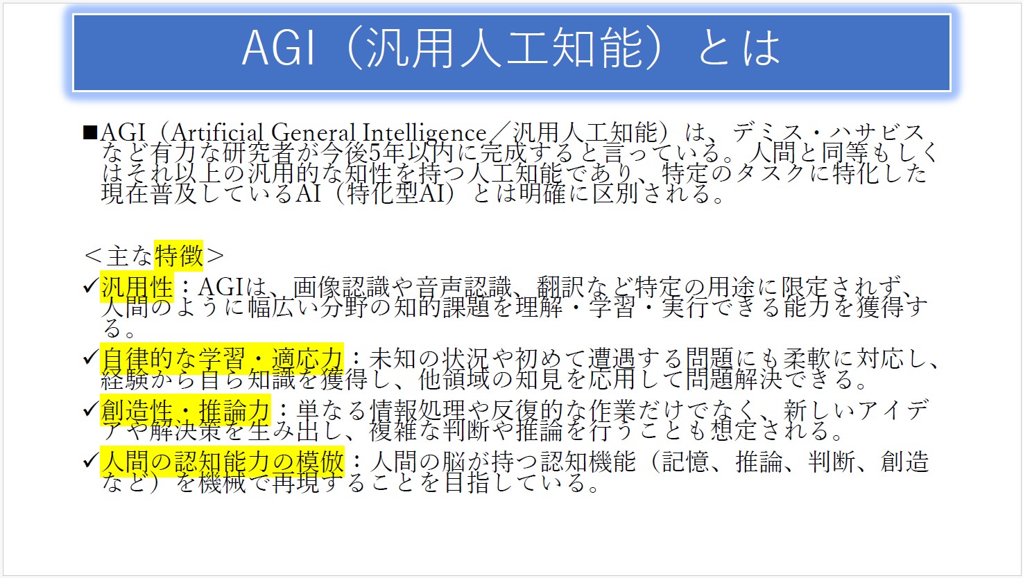 AGIとは、汎用性があって、マルチモーダル(テキスト、画像、音声、動画、センサー情報など異なるデータ形式のこと)で人間の五感に近づき、自律的な学習適応能力があり、初めて遭遇する問題にも柔軟に対応して解決できる。創造性・推論力もあり、人間の認知能力を模倣することもできる。要は、人間のように、いや人間以上に、何でもできるAIの実現が近づいている。