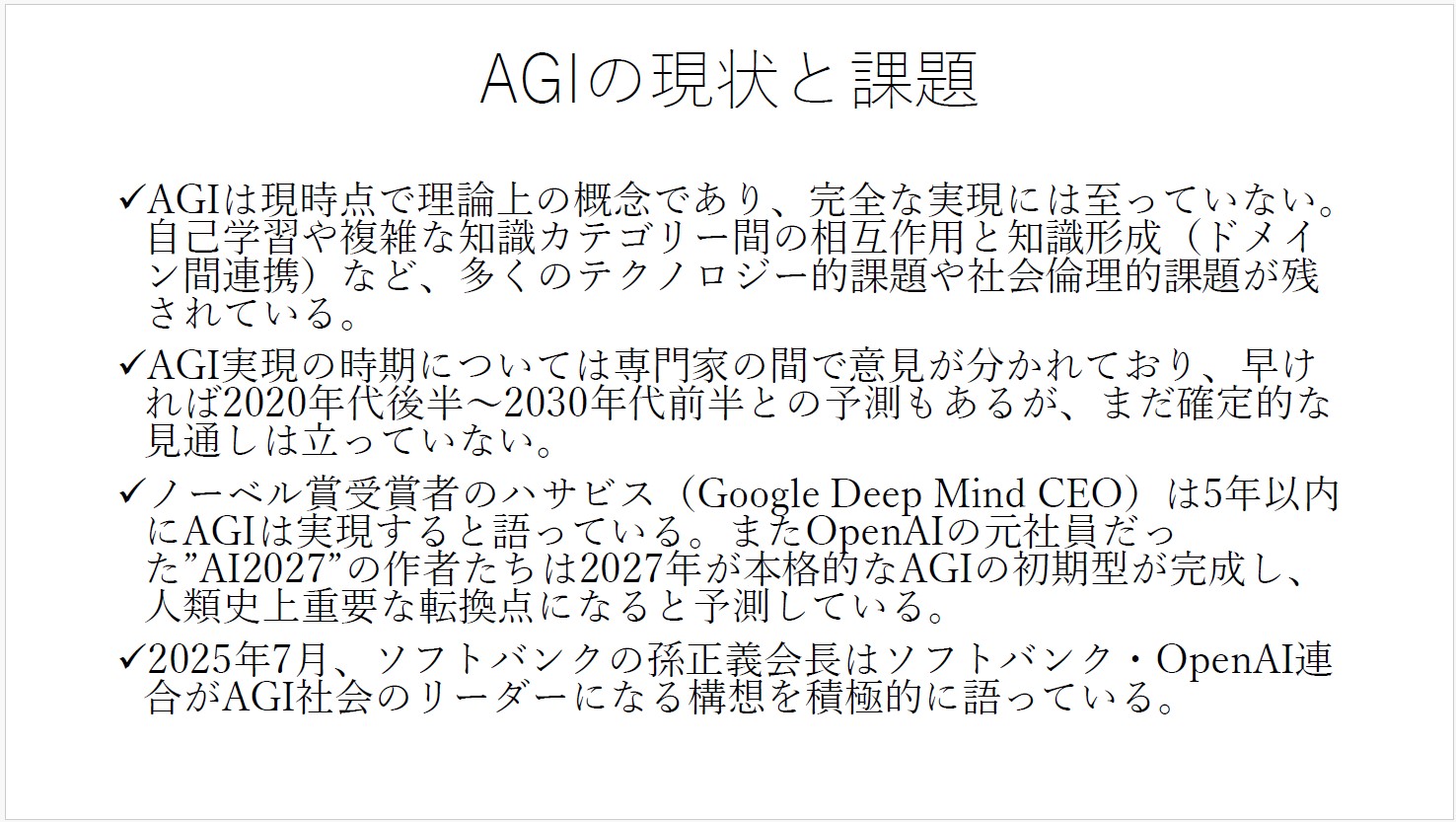 ちなみに、ソフトバンクの孫正義さんは、SoftBank World 2025の講演で、OpenAIとの連合でAGI、そしてASIのリーダーになると宣言し、AIが代替するのでSE(システムエンジニア)はもう要らなくなるという認識を示した。米Salesforceのマーク・ベニオフCEOも同様の理由から今年はSEを採用しないと公言している。私の研究室の学生には、「Pythonなどが書ければ就職できた時代はそろそろ終わる。これからどのような能力を身につければいいのか一緒に考えよう」と話しているところだ。