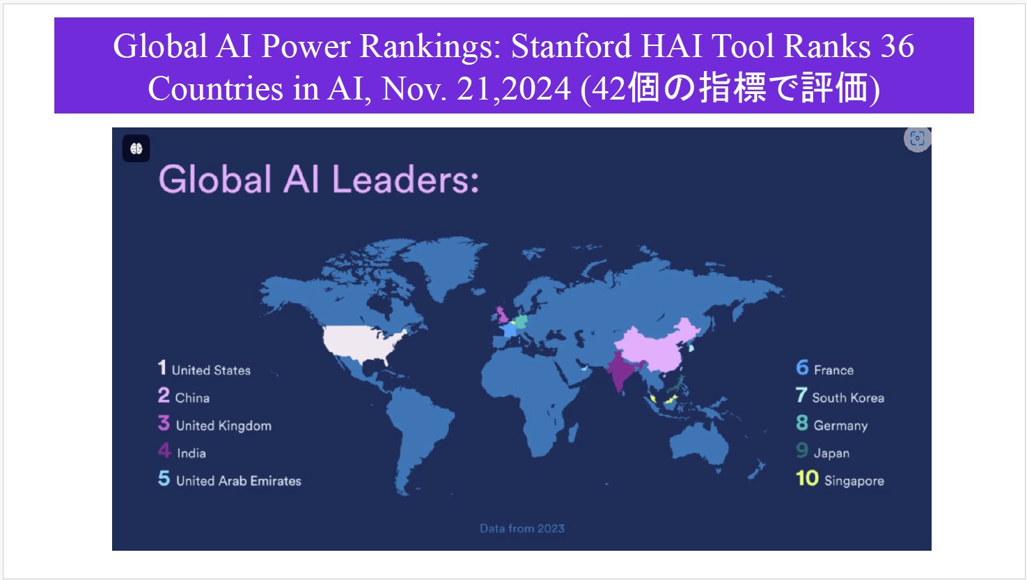 米スタンフォード大学の人間中心AI研究所(Human-Centered Artificial Intelligence, HAI)は2024年11月、42個の指標を使って36か国を比較分析したランキングを発表した(Global AI Power Rankings: Stanford HAI Tool Ranks 36 Countries in AI)。余談だが、この地図はAIで作ったものと推察されるが、日本列島の位置が大きくずれているのは現在のAIはまだ発展途上であることを示している。