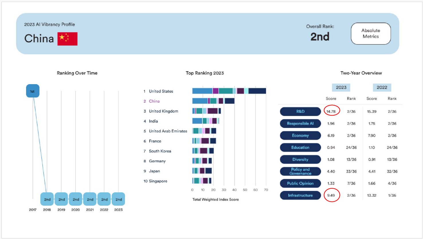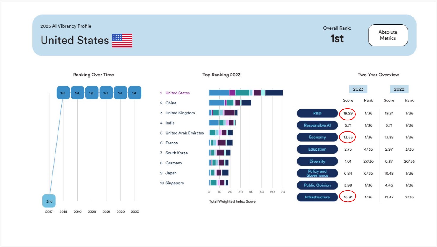 国別の分析では、1位の米国は「R&D」のポイントが非常に高く、「Economy(経済的波及効果)」も大きく、スーパーコンピューターやデータセンターといったAI開発・活用のための「Infrastructure」の整備が進んでいる。