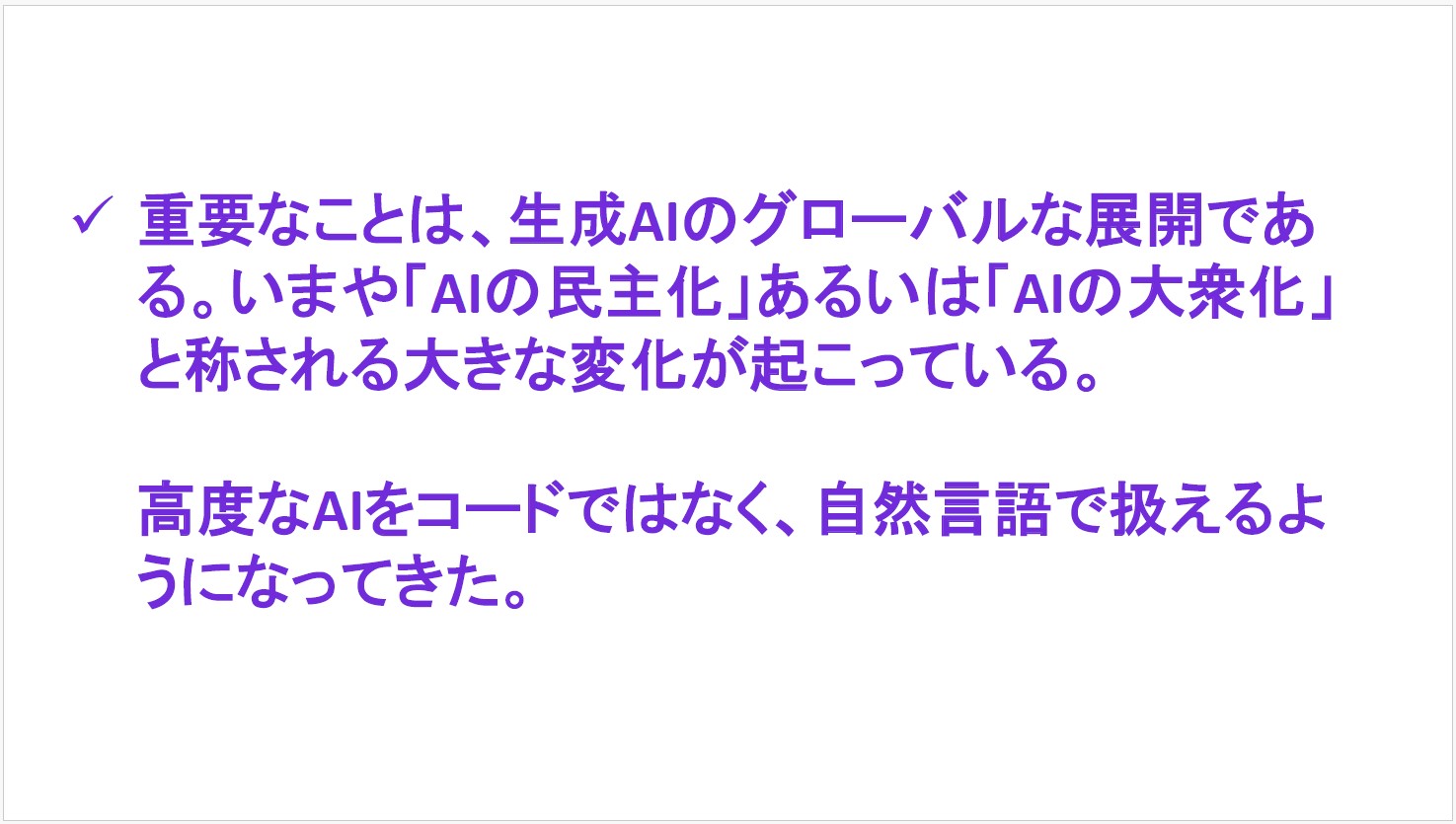 今、何が起きているかという観点で理解しておくべきことは、AIの民主化とかAIの大衆化という現象はかつてない大きな変化だということである。