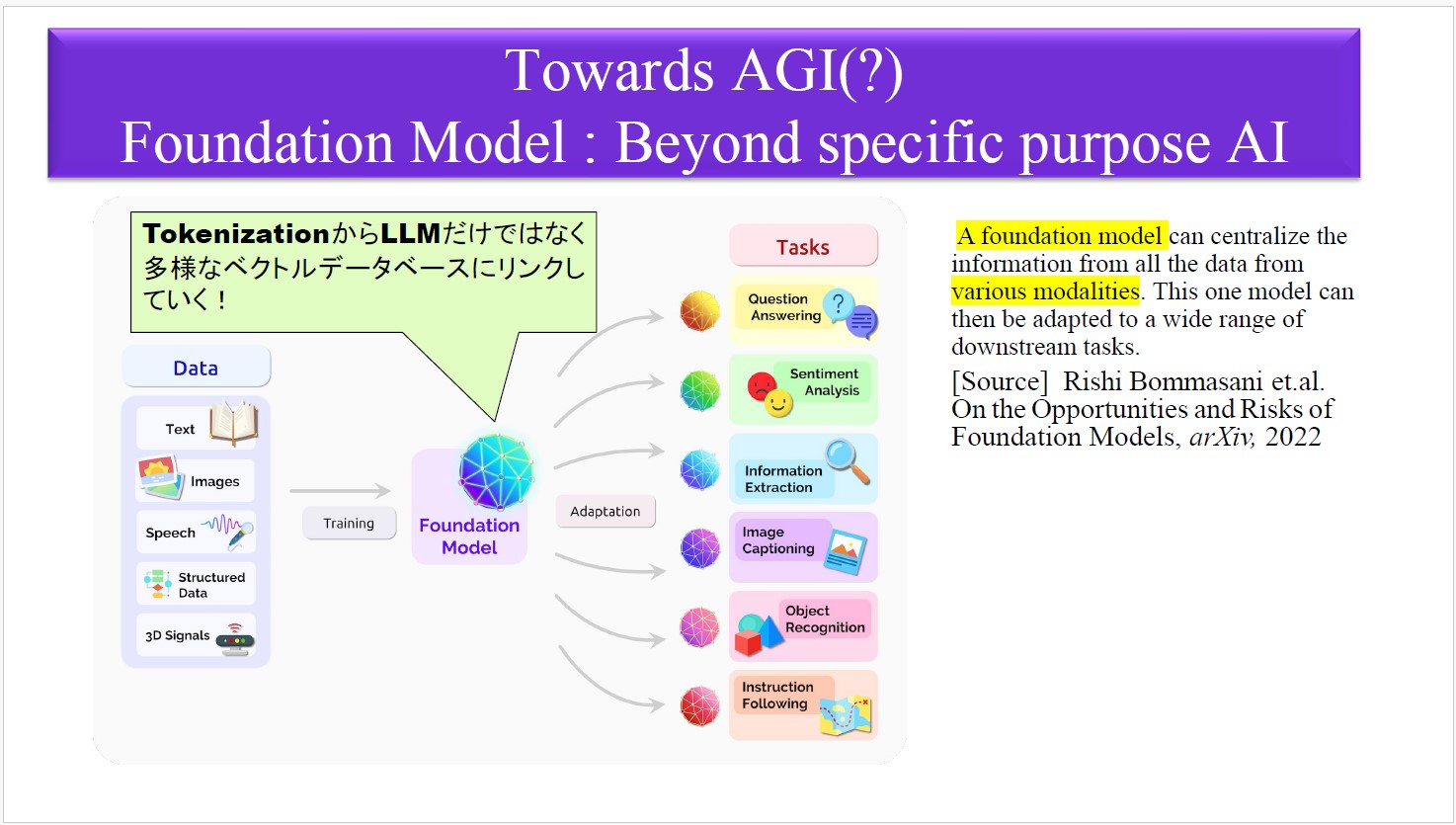 もう一つ、今起きている大きな変化は、大量かつ多様なデータをAIに学習させる「基盤モデル(ファウンデーションモデル)」が、LLM(大規模言語モデル)のようなテキストに特化したものから、画像や動画、音声、構造化されたデータなどを含めて学習させるマルチモーダル型へと急速に進化しつつあることである。汎用型のファウンデーションモデルに関する研究は、例えば米スタンフォード大学の研究者などによって2000年くらいから進められていた。(最近の参考文献:On the Opportunities and Risks of Foundation Models)