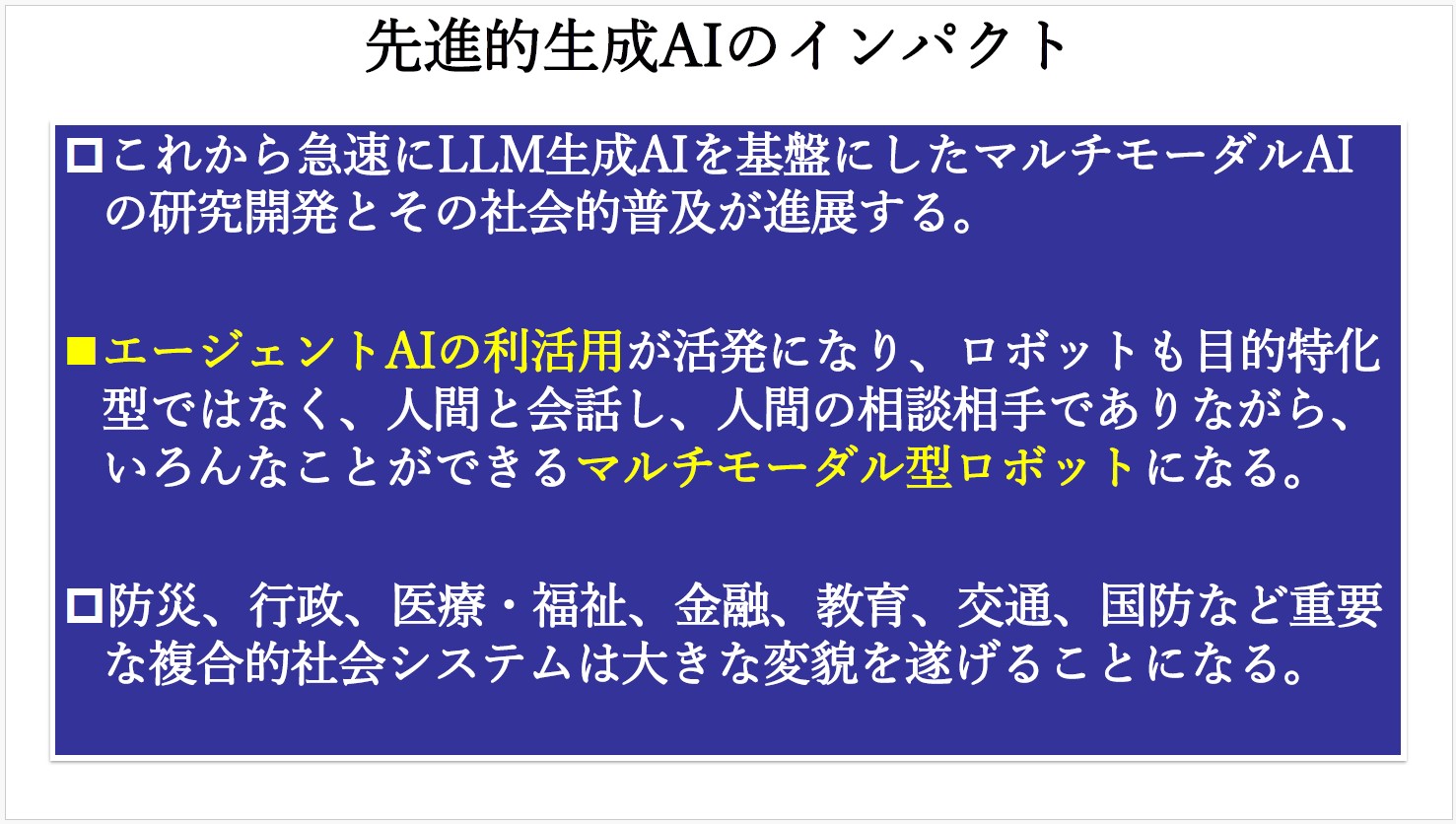 すなわち、マルチモーダルAIが動き出すと防災、行政、医療、福祉、金融、教育、交通、国防などの社会システムが大きな変貌を遂げる。これまでそれぞれのシステムが単独で機能していたものが、AIを介して繋がり合い相互作用を起こし、全体のレベルが上がる。今後2年くらいで劇的な変化が起こる可能性が高い。