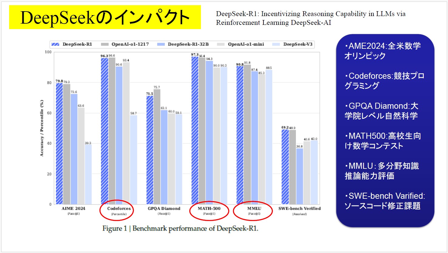 DeepSeekの論文(DeepSeek-R1: Incentivizing Reasoning Capability in LLMs via Reinforcement Learning)によれば、OpenAIとDeepSeekのベンチマーク比較で、AME2024(全米数学オリンピック)、Codeforces(競技プログラミング)、MATH500(高校生向け数学コンテスト)、MMLU(他分野知識推論能力評価)などでいずれも高得点を叩き出し、人間よりも優秀である。SWE-bench Verified(ソースコード修正課題)などはまだ苦手なようだが、GPQA Diamond(大学院レベル自然数学)ではかなり高いレベルまで上がってきている。しかも、DeepSeekはマルチモーダルではなく、従来型の生成AIモデルでここまで実現したことに驚きの声が上がっている。