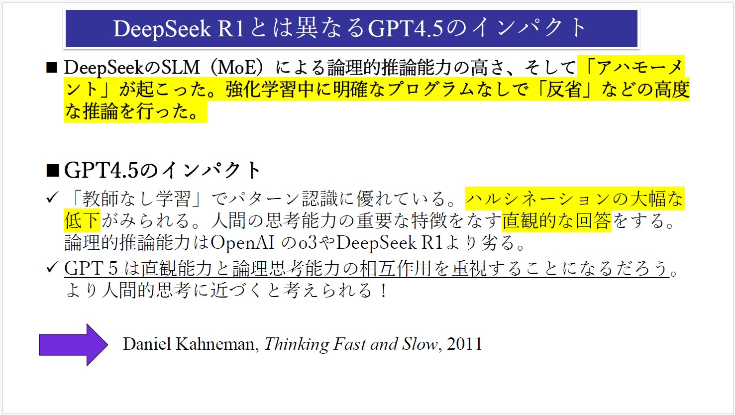 OpenAIのGPT4.5は、異分野の知識を連結させ、その相互作用によって新たなアイデアを生むということを試みている。これは、人間の思考能力の重要な特徴である「直観力」を強化しようというもの。その分、推論能力は弱いが、人間的になってきたと言える。GPT5では、直感能力と推論能力を連結させ、より人間的思考に近づいていくだろう。