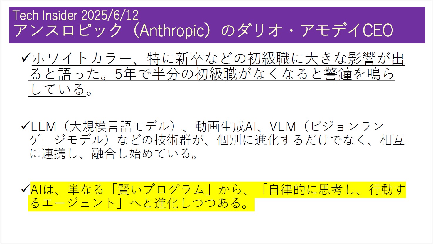 米AnthropicのDario Amodeiは、「今後1年から5年の間に、AIによって新卒レベルのホワイトカラー職の50%が消滅する可能性がある」(「AIがエントリーレベルの仕事を半滅させる…企業や政府はリスクを「都合よくごまかしている」、Business Insider)という厳しい見通しを示している。特にプログラミング、コーディングの領域では、新卒レベルではAIに太刀打ちできず、研修費がかかるだけで即戦力にならないので、熟練者の中途採用にシフトするというIT企業も出てきている(前述のSalesforce CEO等)。