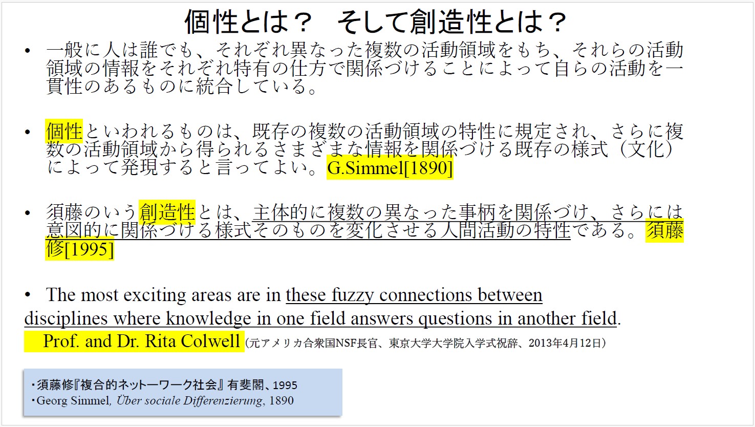 私はそれにヒントを得て、「創造性」というものは、そういう関係づけのあり方を自分で工夫して、自分で関係性を作っていく行為、だと考えた。そうした創造性を持てば、自分が変えられる、そして自分と接触する人も変えることができる。そして、偉人と呼ばれるような人たちは、凡人とは違う知の結び付け方、行動の関係づけをしているのだということに気が付いた。だとすれば、そのメカニズムと関係式を可視化すれば、他の多くの人たちも同様に「創造性」を磨くことができるのではないか。さらには、AIもそういうアプローチによって創造性を体得できるのではないかということになる。こうした考えについては、拙著『複合的ネットワーク社会』(有斐閣刊、1995年)にまとめている。