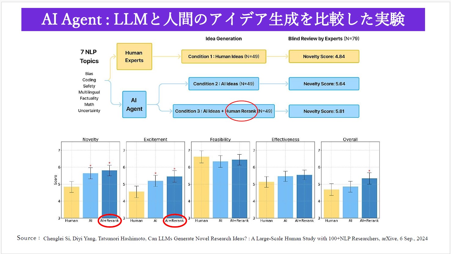 タイトルは「Can LLMs Generate Novel Research Ideas? A Large-Scale Human Study with 100+ NLP Researchers」(Chenglei Si, Diyi Yang, Tatsunori Hashimoto、2024年9月)、和訳すれば「LLMは斬新な研究アイデアを生み出せるか?」というもの。自然言語処理(NLP)分野の7つのテーマに関するアイデアの生成を、人間の専門家とAIで競わせる実験を行ったところ、「Novelty(新規性)」の項目で明らかに人間よりAIのスコアが優るという結果となった。