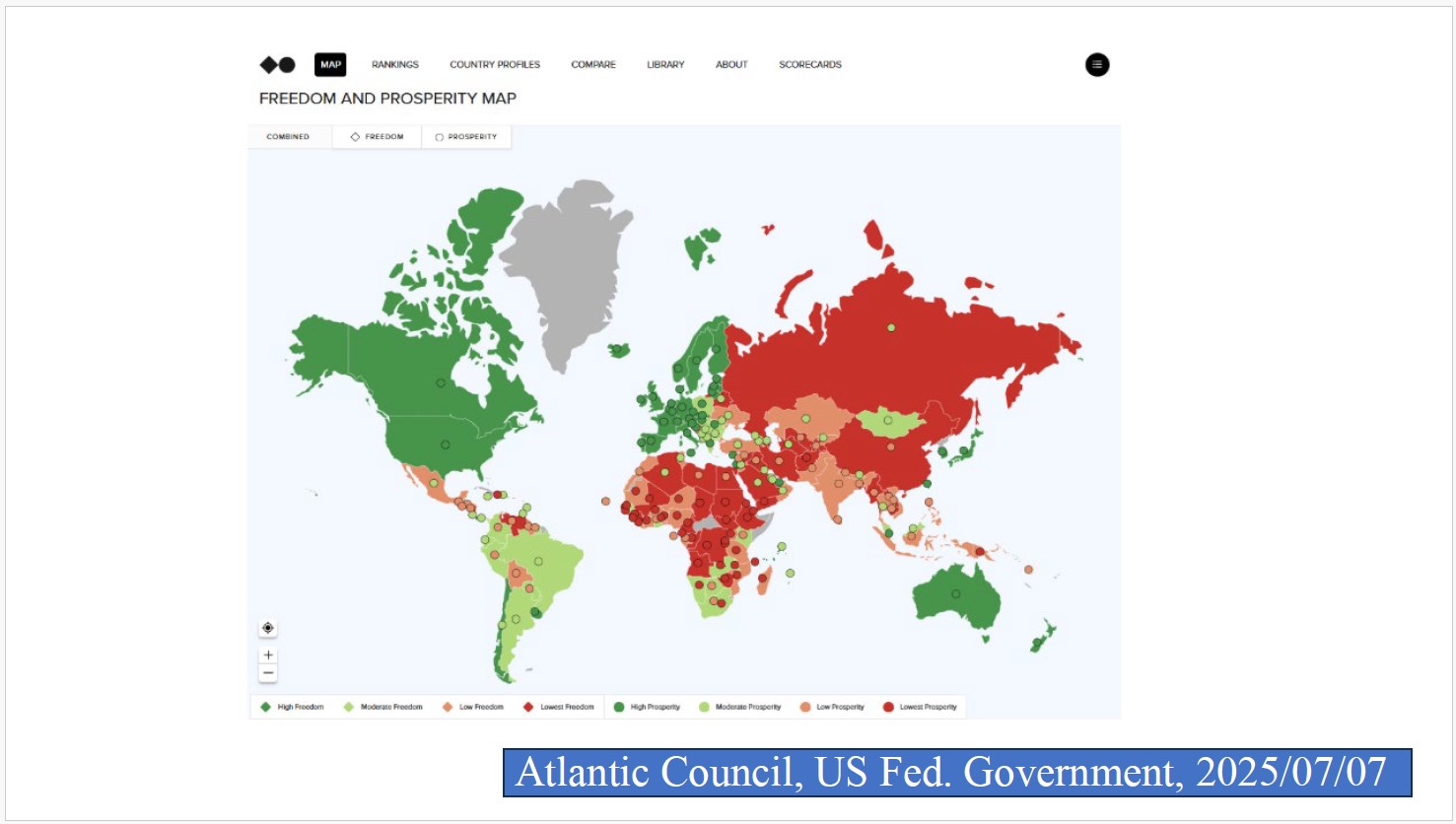 米シンクタンクのAtlantic Councilが毎年更新している「Freedom and Prosperity Indexes」という地図がある。濃い緑と黄緑は自由民主主義の国々で、米国、カナダ、西欧諸国、オーストラリア、日本などが代表的。オレンジと赤は、自由が少ない国々でロシア、中国、アフリカ諸国、アラビア諸国など。