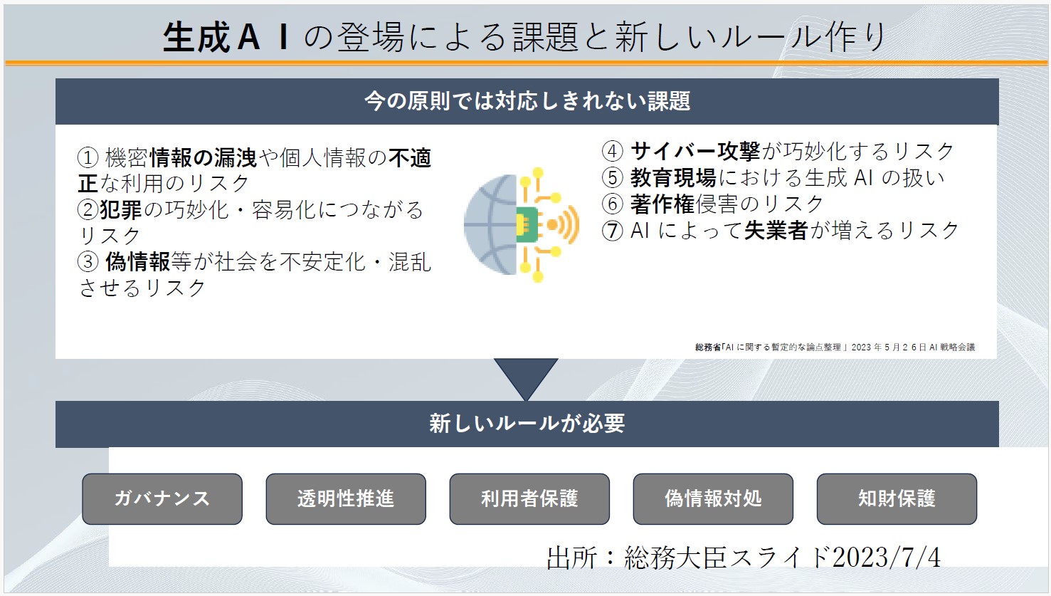 私は松本剛明総務大臣(当時)のサポート役として関わった。今の原則では対応しきれない課題として、①機密情報の漏洩や個人情報の不適正な利用のリスク、②犯罪の巧妙化・容易化につながるリスク、③偽情報等が社会を不安定化・混乱させるリスク、④サイバー攻撃が巧妙化するリスク、⑤教育現場における生成AIの扱い、⑥著作権侵害のリスク、⑦AIによって失業者が増えるリスク――などを挙げ、ガバナンス、透明性推進、利用者保護、偽情報対処、知財保護のための新しいルールが必要だという提案に至った。その結果、2023年12月には、「広島AIプロセス包括的政策枠組み」がまとまり、承認された。