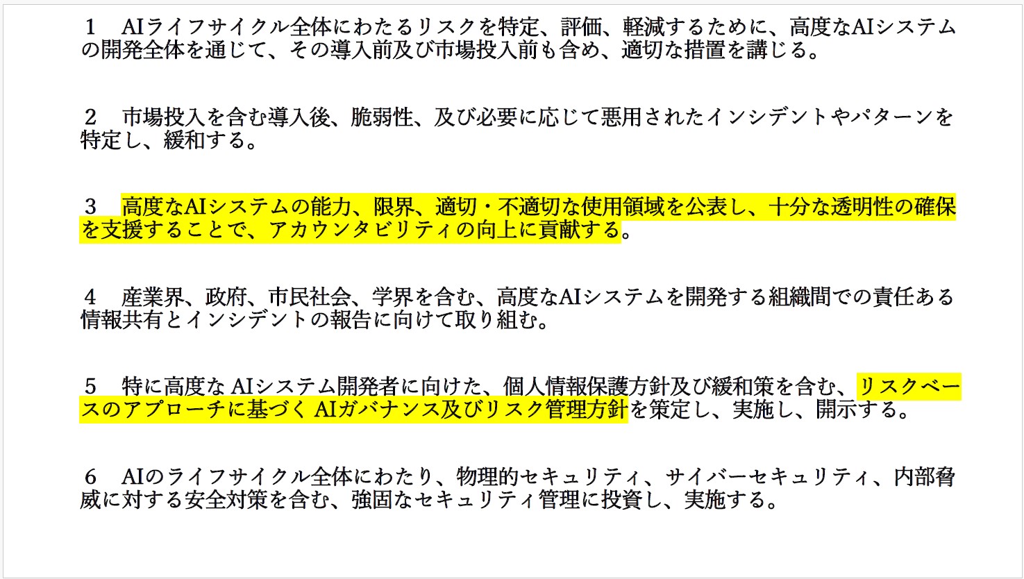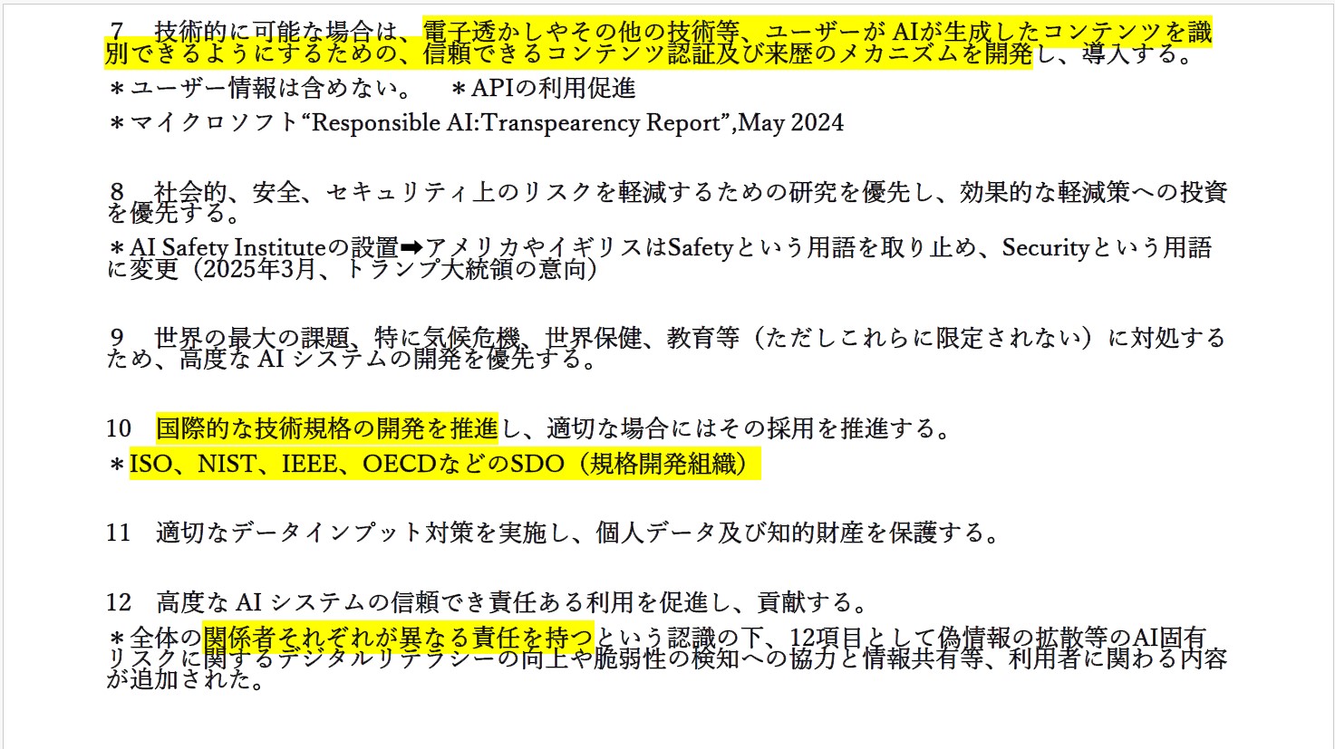 11番目までは、AIの開発やサービス提供に対する指針だが、「利用」に関して責任を持たせるものとして12 番目の「高度なAIシステムの信頼でき責任ある利用を促進し、貢献する。」が追加された。