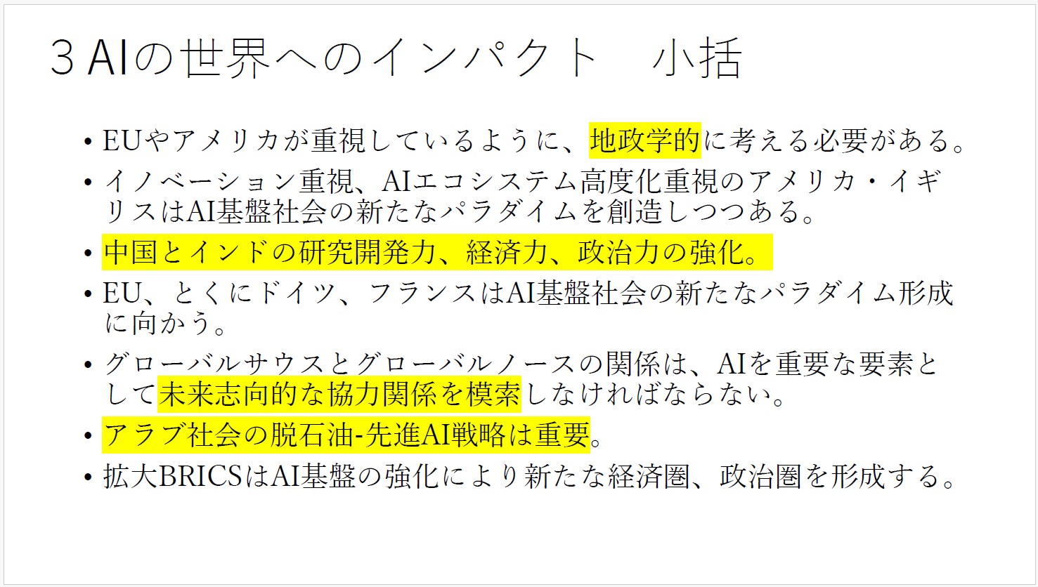 今後の世界を見通すためには、「AIがこれまでの地政学を塗り替える」という視点を持つ必要がある。①イノベーション重視、AIエコシステム高度化重視のアメリカ、イギリス、②研究開発力、経済力、政治力を急速に高めている中国とインド、③AI基盤社会の新たなパラダイム形成を目指すドイツ、フランス、④脱石油の流れの中で積極的に先進AI戦略を推進するアラブ諸国、⑤AI基盤の強化で新たな経済圏・政治圏の形成を目指す拡大BRICS(ブラジル、ロシア、インド、中国、南アフリカ、イラン、エジプト、アラブ首長国連邦、エチオピア、インドネシアの10カ国)――等々。