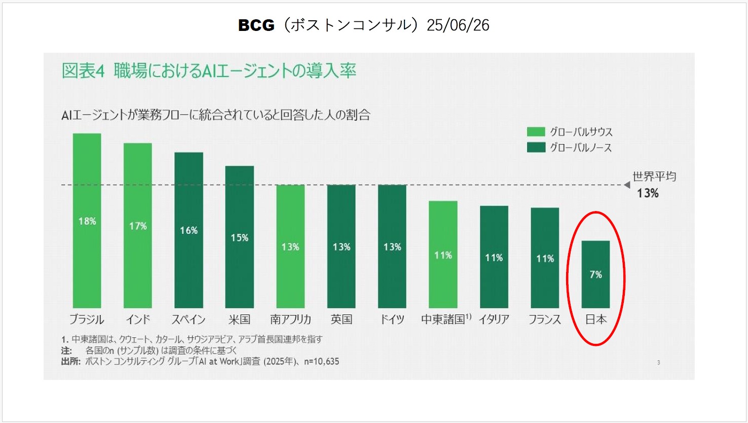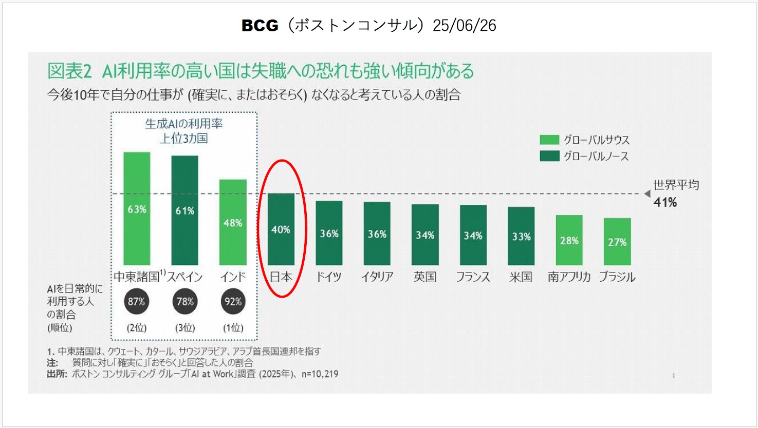ボストンコンサルティンググループ(BCG)が2025年6月26日に公表した「職場におけるAI活用に関する意識調査2025」(AI at Work 2025: Momentum Builds, But Gaps Remain)を参照しながら、日本にとってプラスなのかマイナスなのかを概観してみる。