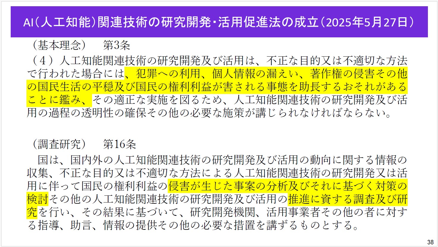 ただし、犯罪への利用、個人情報の漏洩、著作権の侵害など、国民の権利利益が害されるようなことがないよう、研究開発や活用の過程の「透明性の確保」が必要であり、そのために必要な事案分析、対策検討、調査研究を行うことを明記(第3条、第16条)。国民の権利と安全を守ることにも配慮されている。