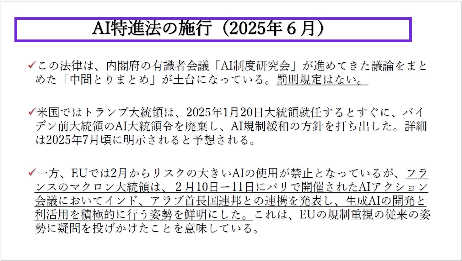 AI推進法に「罰則規定」がない点には批判もある。しかし、罰則規定を作るとなると非常に丹念に検討しなければならず、審議に長い時間がかかってしまう。AIの進化スピードは非常に速く、3~4カ月で状況が大きく変わってしまい、国会で法律が成立した頃にはもはや時代遅れなものになってしまう。罰則は既存の刑法や電気通信事業法などに任せ、新たな規制を被せることをあえてしなかった。その理念と意義は広く理解されるべきだ。