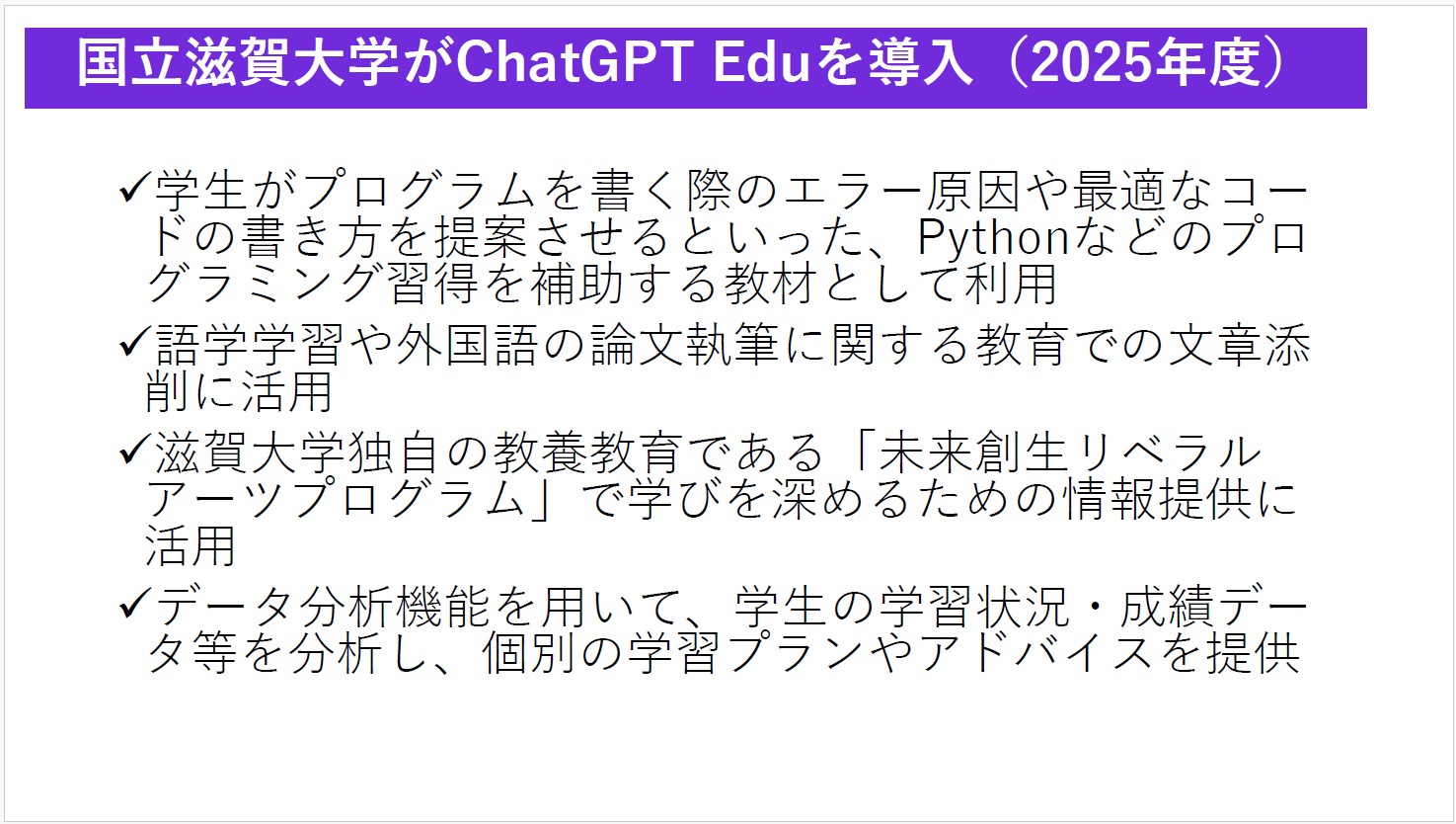 例えば、滋賀大学は2025年4月からOpenAIのChatGPT Education(ChatGPT Edu)を教育現場に本格導入した(「国内初OpenAI社のChatGPT Educationを滋賀大学が導入~すべては学生の学びの向上のために~」、滋賀大学)。日本の大学としては初の試みである。