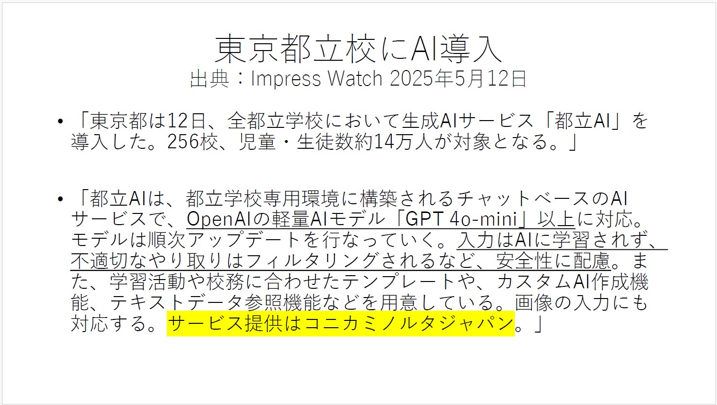 東京都は2025年5月12日、全都立学校において生成AIサービス「都立AI」を導入した。256校、児童・生徒数約14万人が対象となる(「東京都、全都立学校に「都立AI」導入 14万人が学習に活用」、ImpressWatch)。