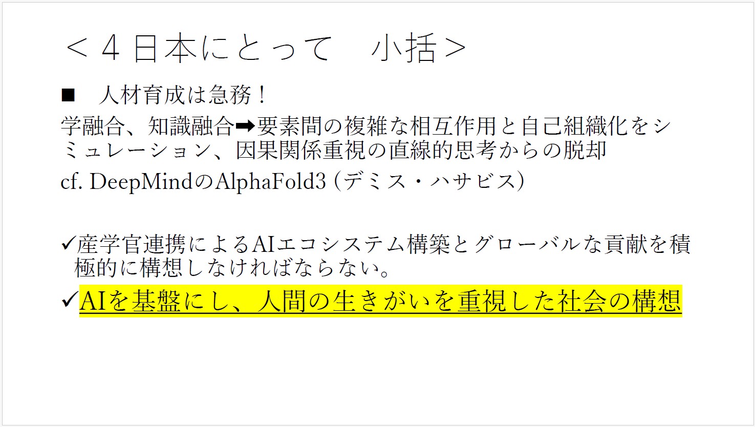 勉強会に参加する他の研究者たちも、「考え方を変えなければならない。今、学問のあり方が大きく変わる過渡期にある。文系理系という枠組みを壊し、学融合、知識融合を進めなければならない」という点で合意した。すなわち、AIが人間の能力に追いつき追い越す中で、これまでとは違う人材育成のかたちを創造しなければならないということである。