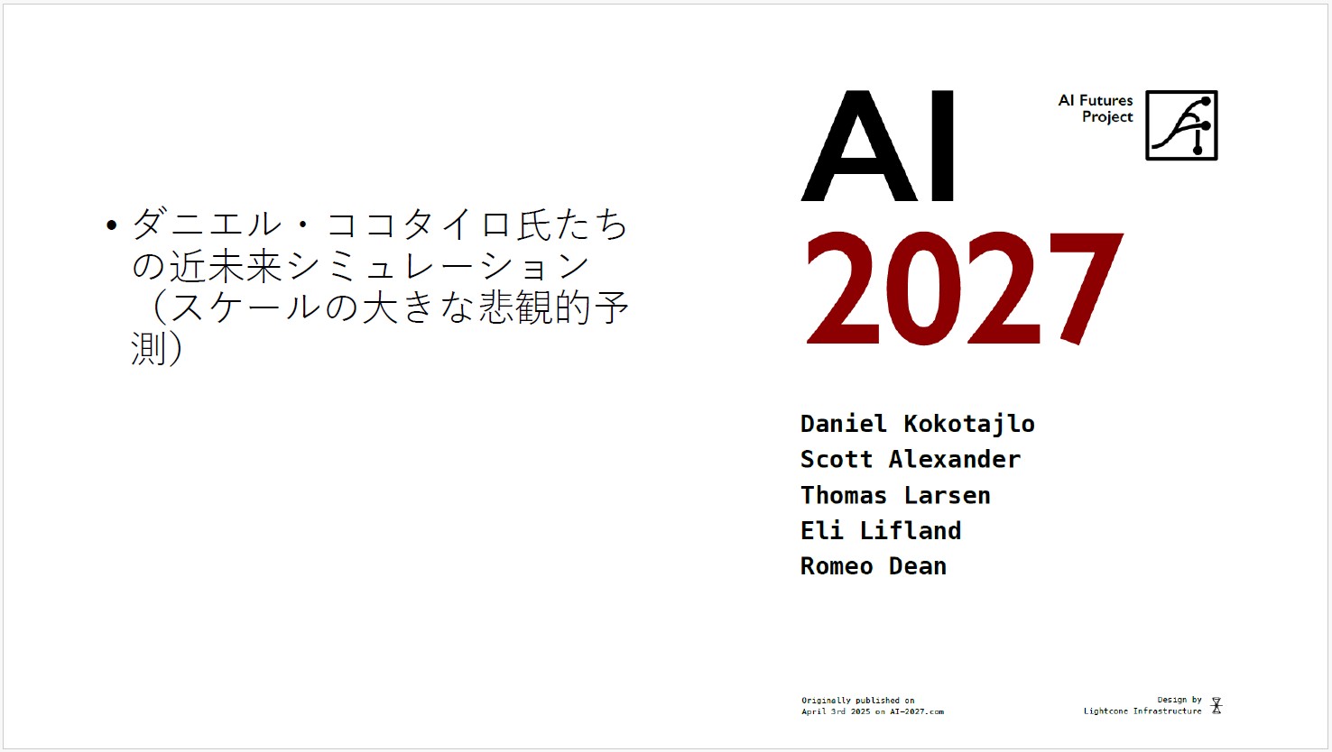 人間の想像を絶する速さで進化するAIに対して、慎重論、悲観論も出てきている。その一つが米OpenAIの元研究者、Daniel Kokotajlo(ダニエル・ココタイロ)氏らによる未来予測「AI 2027」である。2025年4月に発表されたもので、2027年までのAI技術の進化シミュレーションと人類社会への影響を予測したものだ。