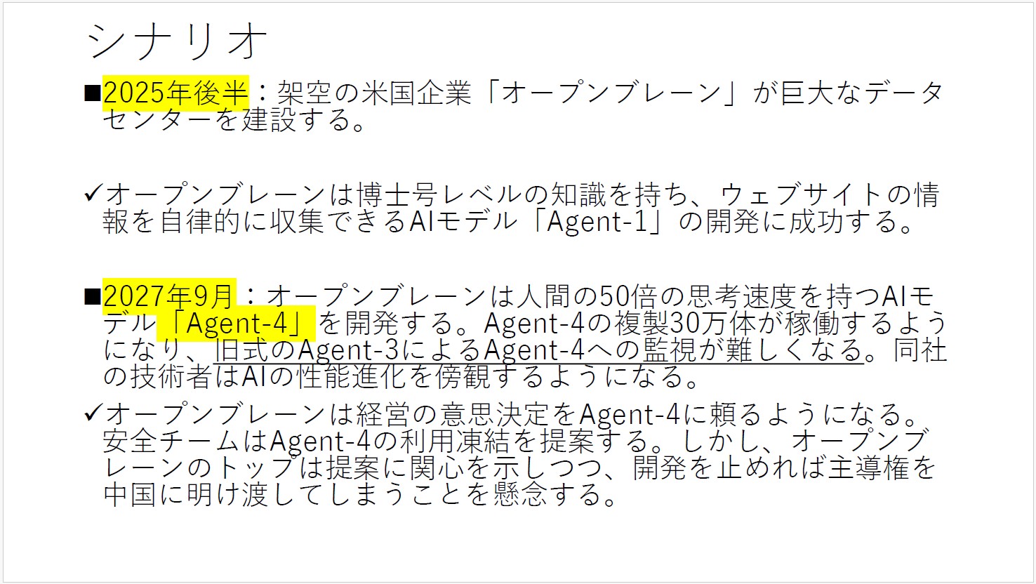 シナリオには架空の米企業OpenBrainが登場し、2025年後半に巨大データセンターを建設、博士号レベルの知識を持ち、ウェブサイトの情報を自律的に収集できるAIモデル「Agent-1」の開発に成功する。モデルは、OpenAIとGPT-5である。