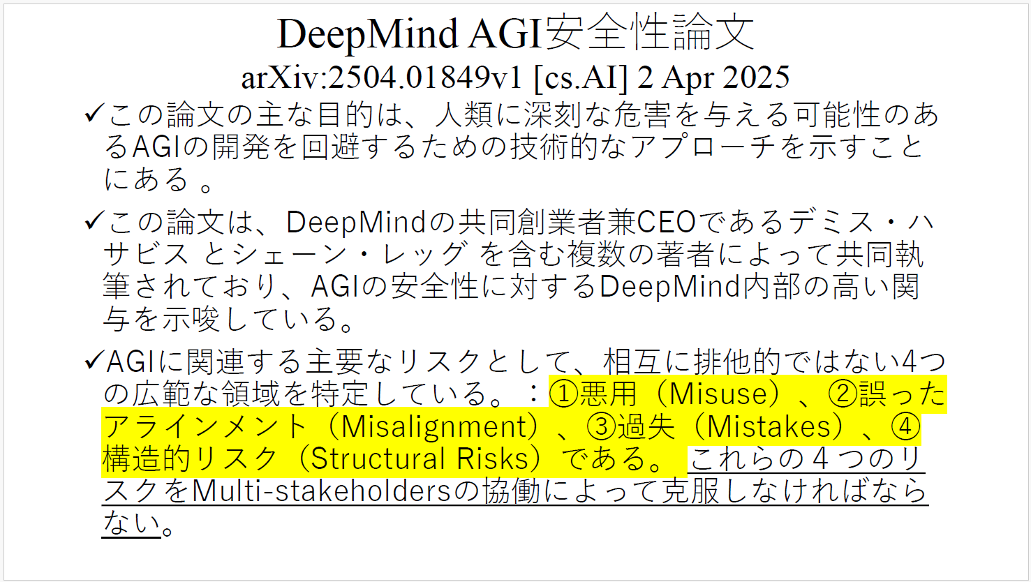AI開発の世界トップを走る企業が、「この論文の主な目的は、人類に深刻な危害を与える可能性のあるAGIの開発を回避するための技術的なアプローチを示すことにある」と明記。その上で、主なリスクの要因として、①悪用(Misuse)、②誤ったアラインメント(Misalignment)、③過失(Mistakes)、④構造的リスク(Structural Risks)を挙げ、マルチステークホルダーの連携によってこれらを管理・ガバナンスする必要があると訴えている。言い換えれば、個別企業の努力では限界があり、社会全体で取り組むべきだという強いメッセージである。