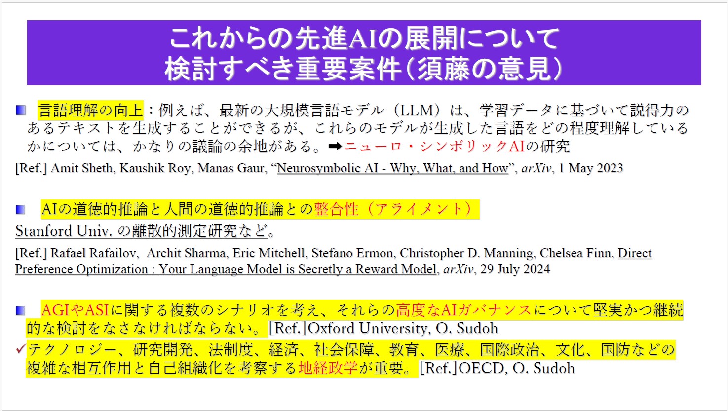 第三に、AGIやASIに関する複数のシナリオを考え、それらの高度なAIガバナンスについて堅実かつ継続的に検討しなければならないということ。こうしたテーマは、デジタル政策フォーラムのように自由闊達に熟議できる場で向き合うべきだと考える。その際、テクノロジー、研究開発、法制度、経済、社会保障、教育、医療、国際政治、文化、国防などの複雑な相互作用と自己組織化を考察する「地経政学」が極めて重要になってくる。