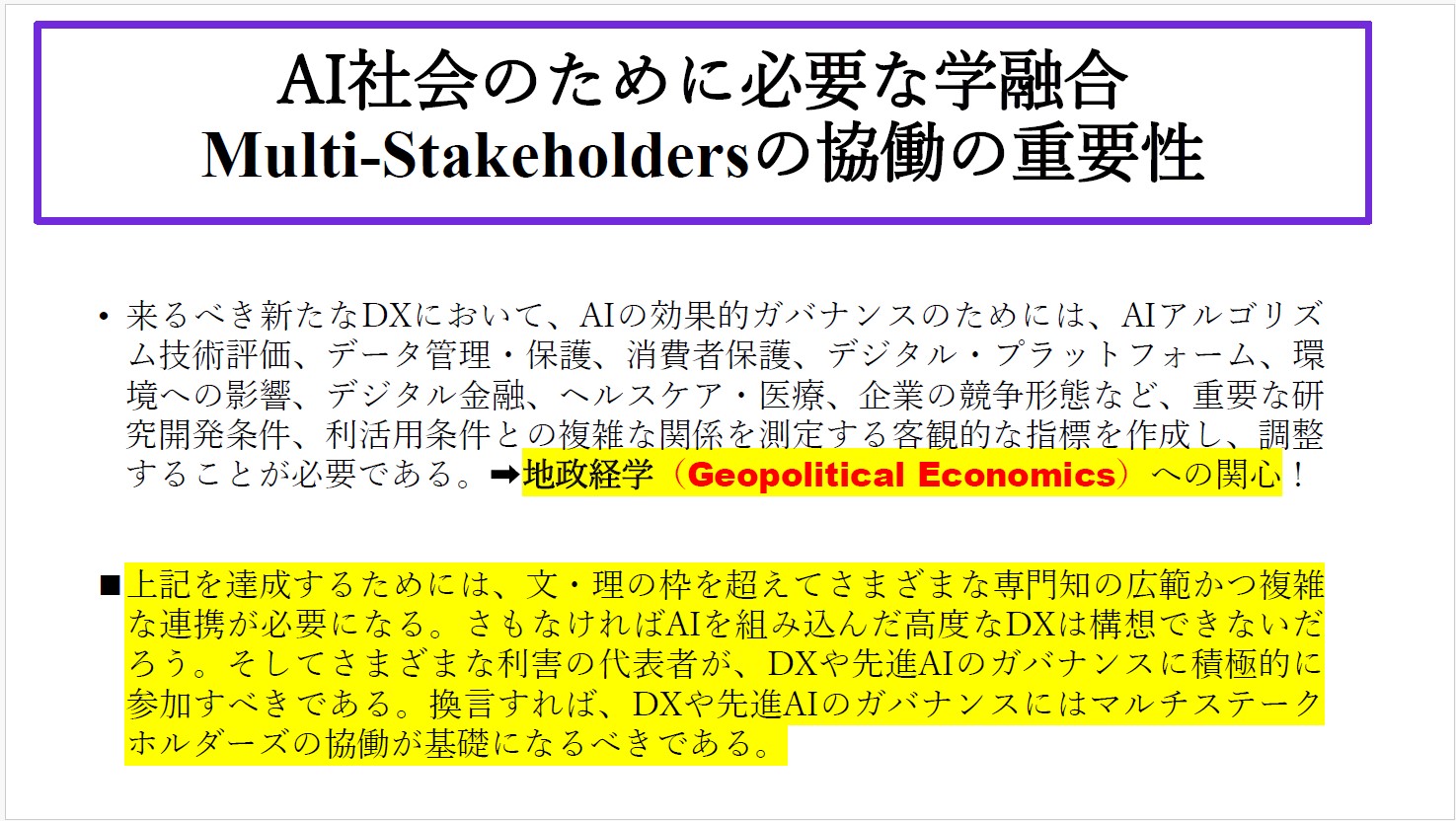 4-8でも述べたが、学問の世界においても真の「学融合」が迫られている。文・理の枠を超え、様々な専門知の広範かつ複雑な連携が必要になる。これからのDXや先進AIのガバナンスには、「マルチステークホルダー」の協働を基礎とすべきなのである。