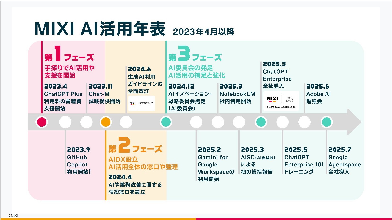- 2025年7月~: AIがないと機能しないワークフロー標準へ(「AIがないと仕事が進まない」月1万7600時間の業務削減を見込むMIXIのAI活用 | ビジネスジャーナル)