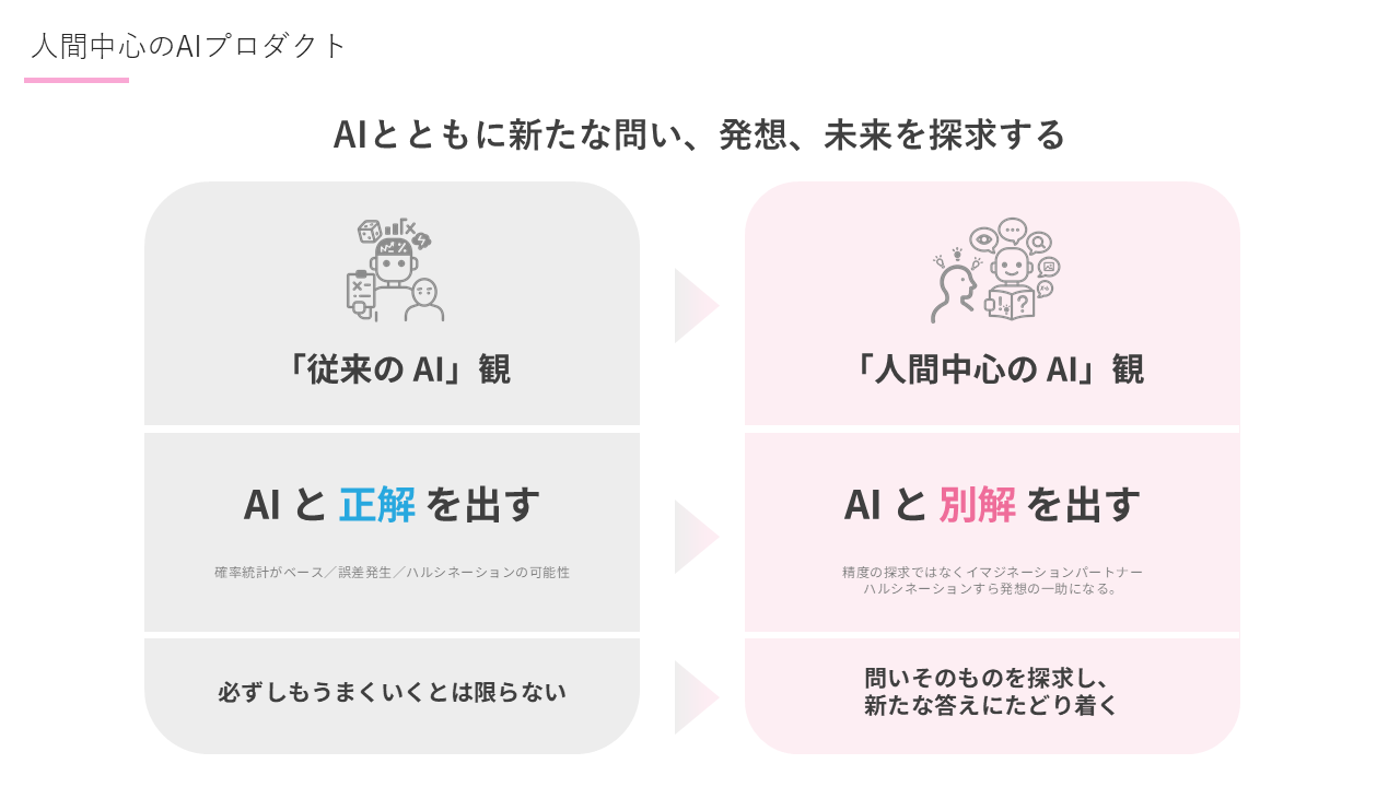 - 広告会社で以前よく行われていた「広告コピーを100本書く」といったタスクはAIなら数秒でアウトプットできてしまう。AIに任せられることは任せ、人間は人間でなければできないことに集中し、全体の付加価値を上げていきたい
